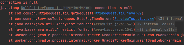 connect는 지정한 Stubbing인 doNothing을 통해 Stubbing 됩니다. 그 후 getRequest메소드를 호출하면 Util객체의 httpURLConnection이 Null인 상태로 메소드를 수행하게 됩니다.
