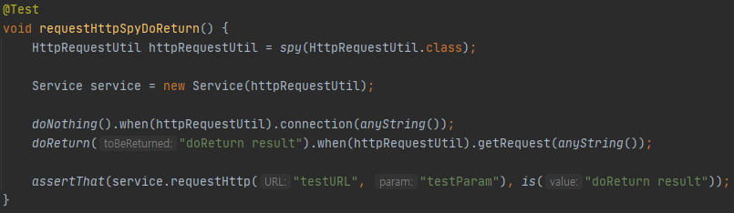 getRequest의 경우는 doReturn을 통해 Stubbing을 작성하여 "doReturn result" 문자열이 반환되는 것처럼 작성하였습니다.
